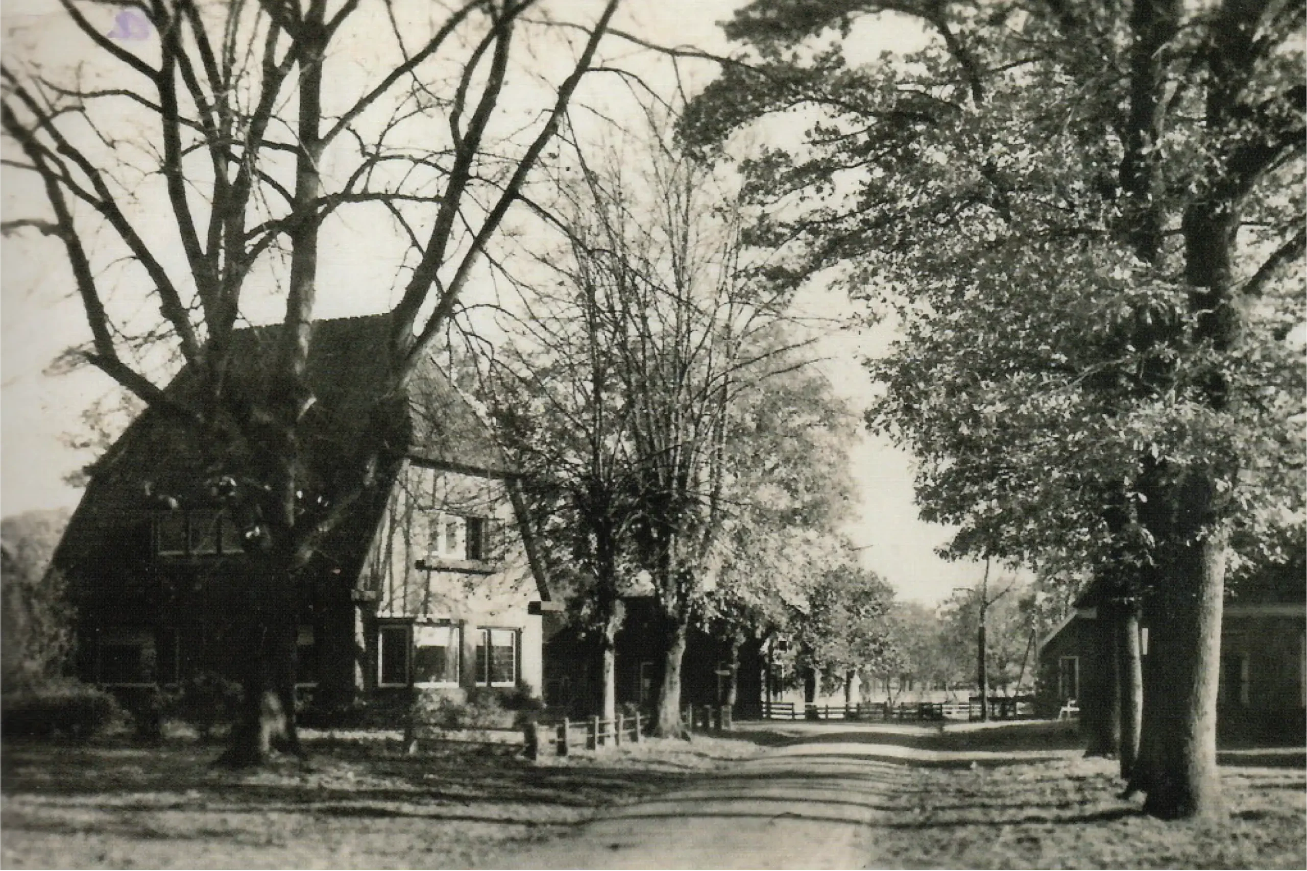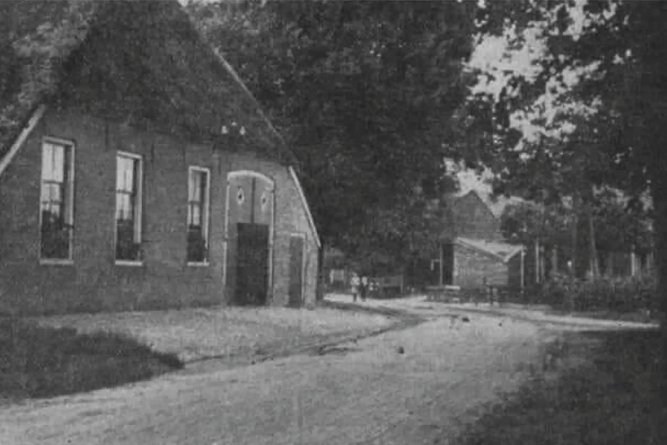 Een foto uit 1907 met rechts een stukje voorgevel van de boerderij van Hamming, met daarachter de boerderij van Smegen en nog verder naar achteren hotel Bieze.