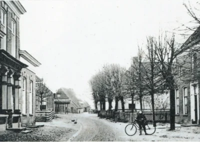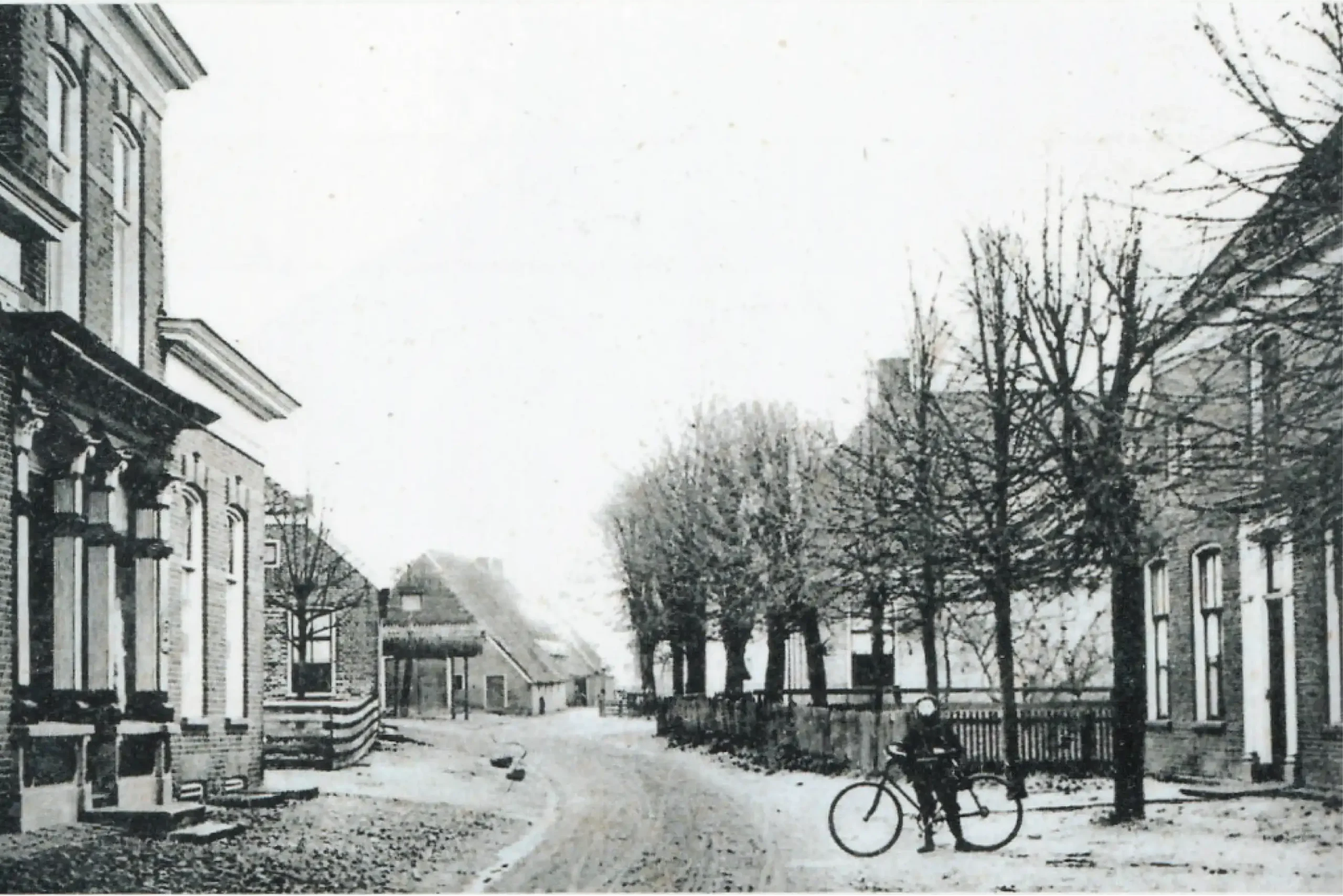 De hoofdstraat zo rond 1935-1940. Links de benzinepompen van garage van der Vlag en daarnaast de boerderij van Slim. Op de achtergrond is hotel Bieze te zien.