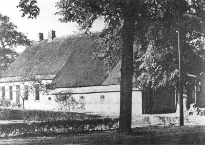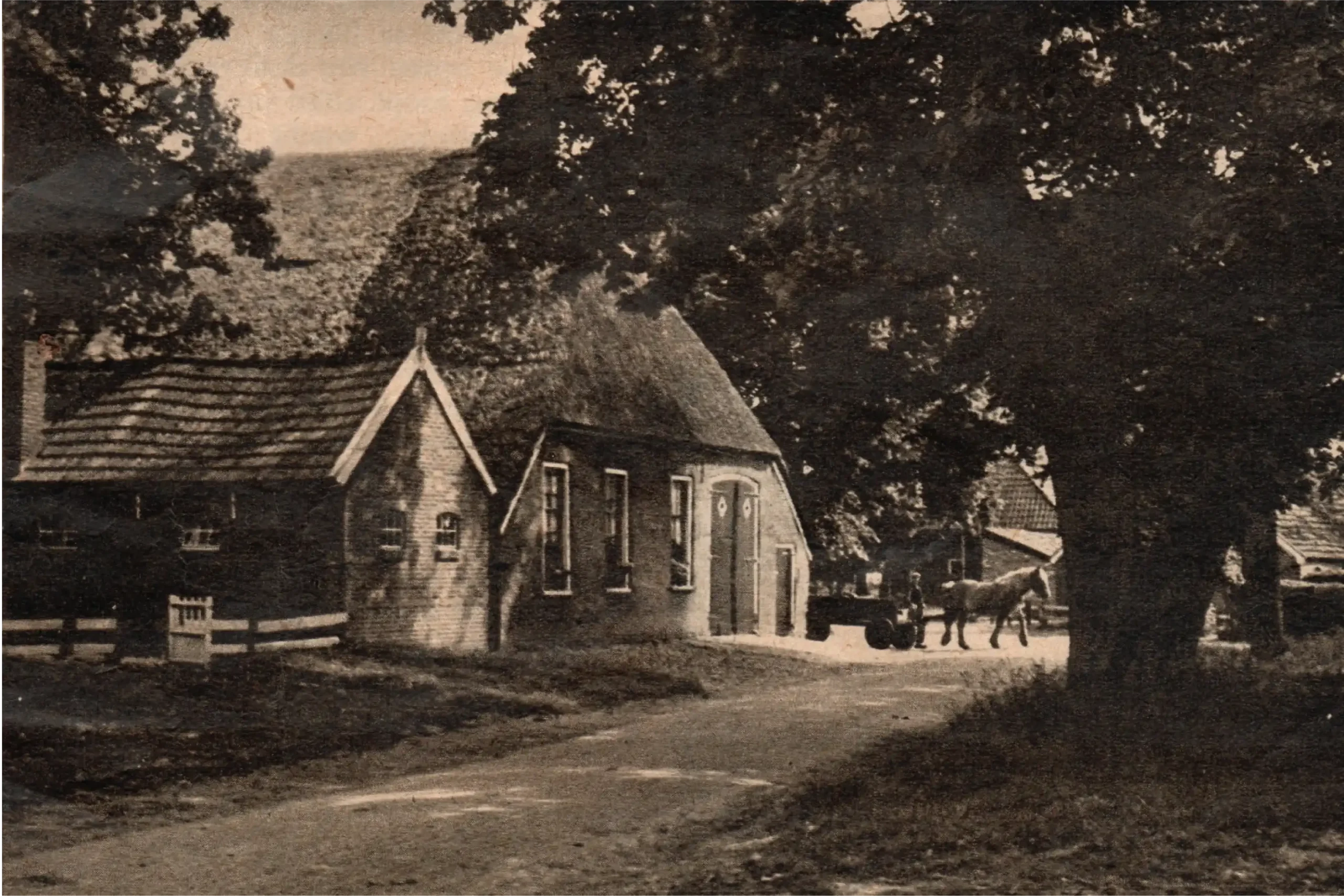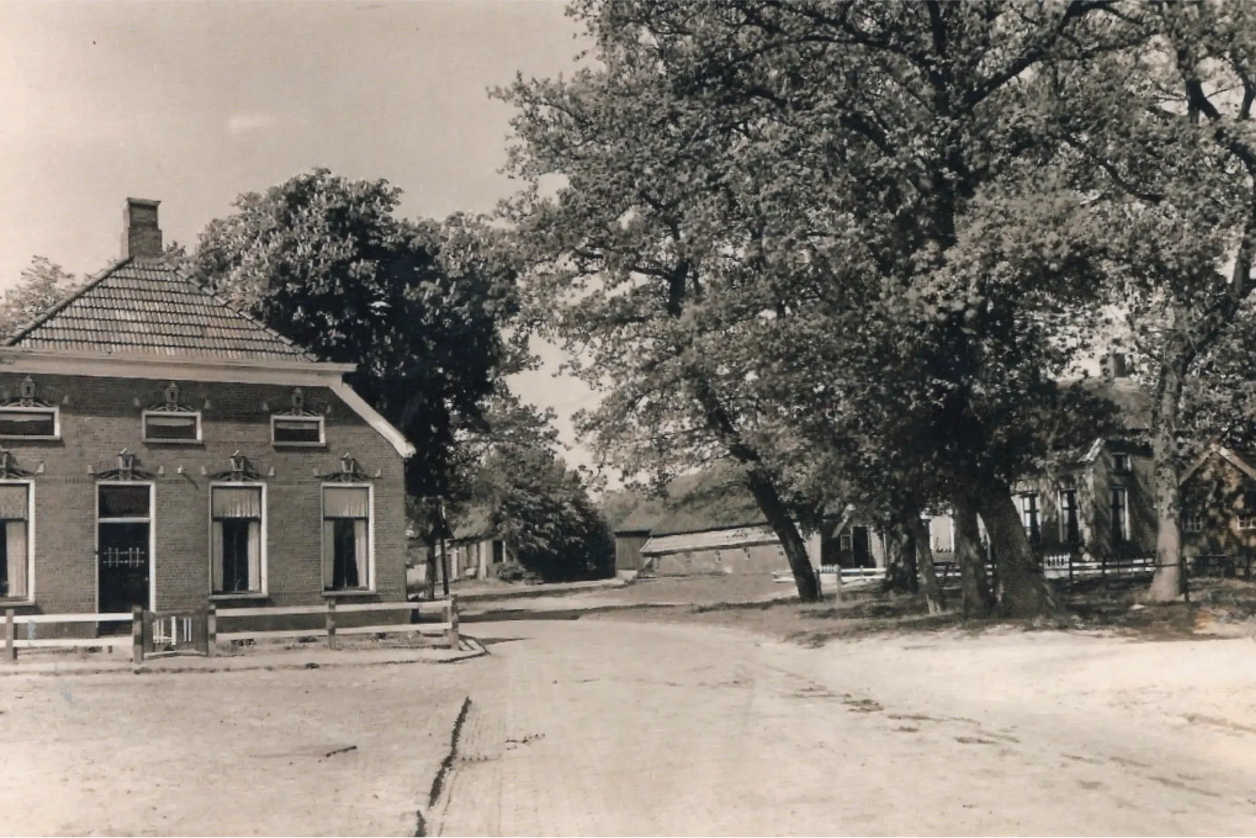 Links de boerderij van Geert Boelens (later van Gerhardus Boelens). Rechts achter het geboomte op de brink de boerderij van Lambert Smits met daarachter de woning van Berend Martens.
