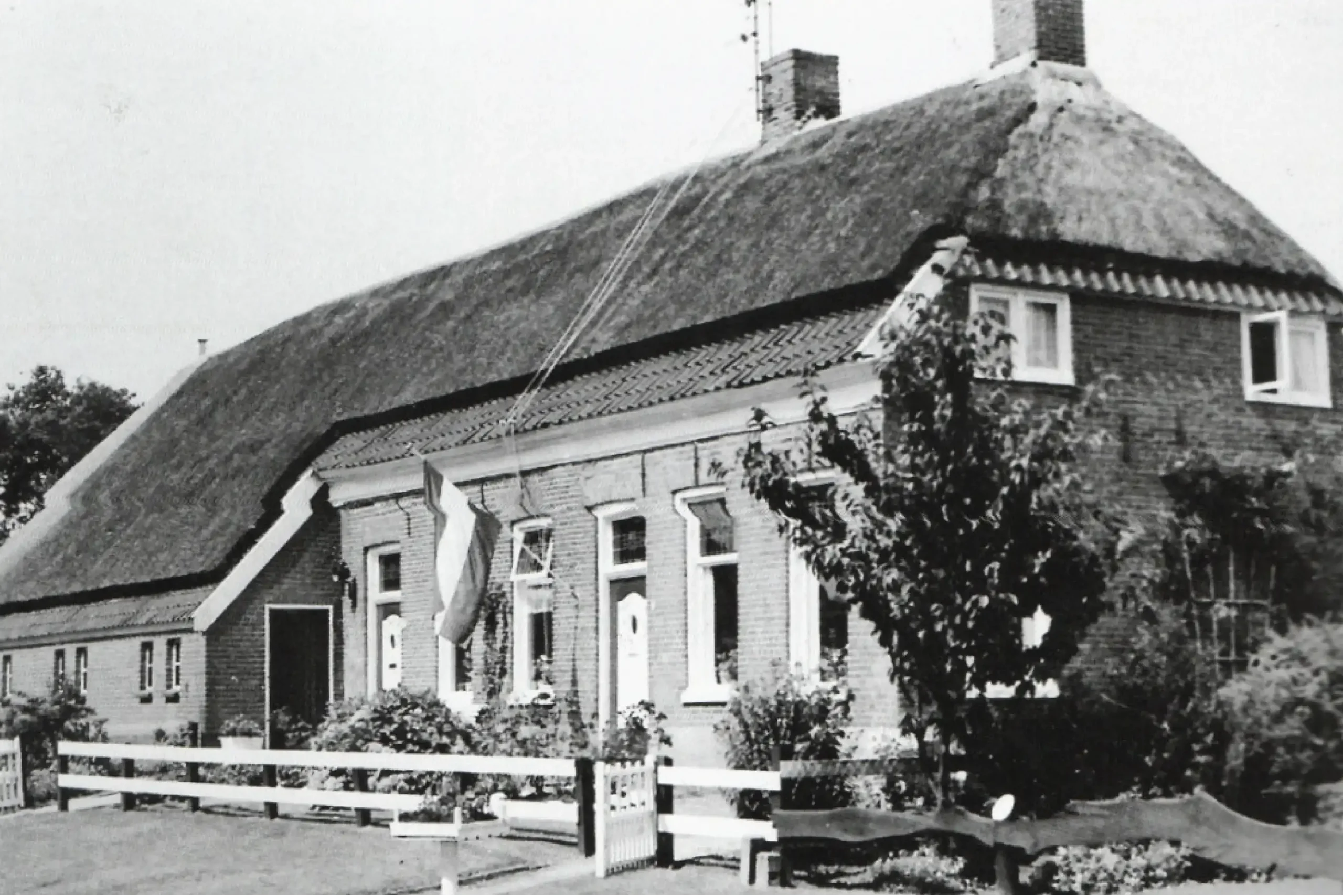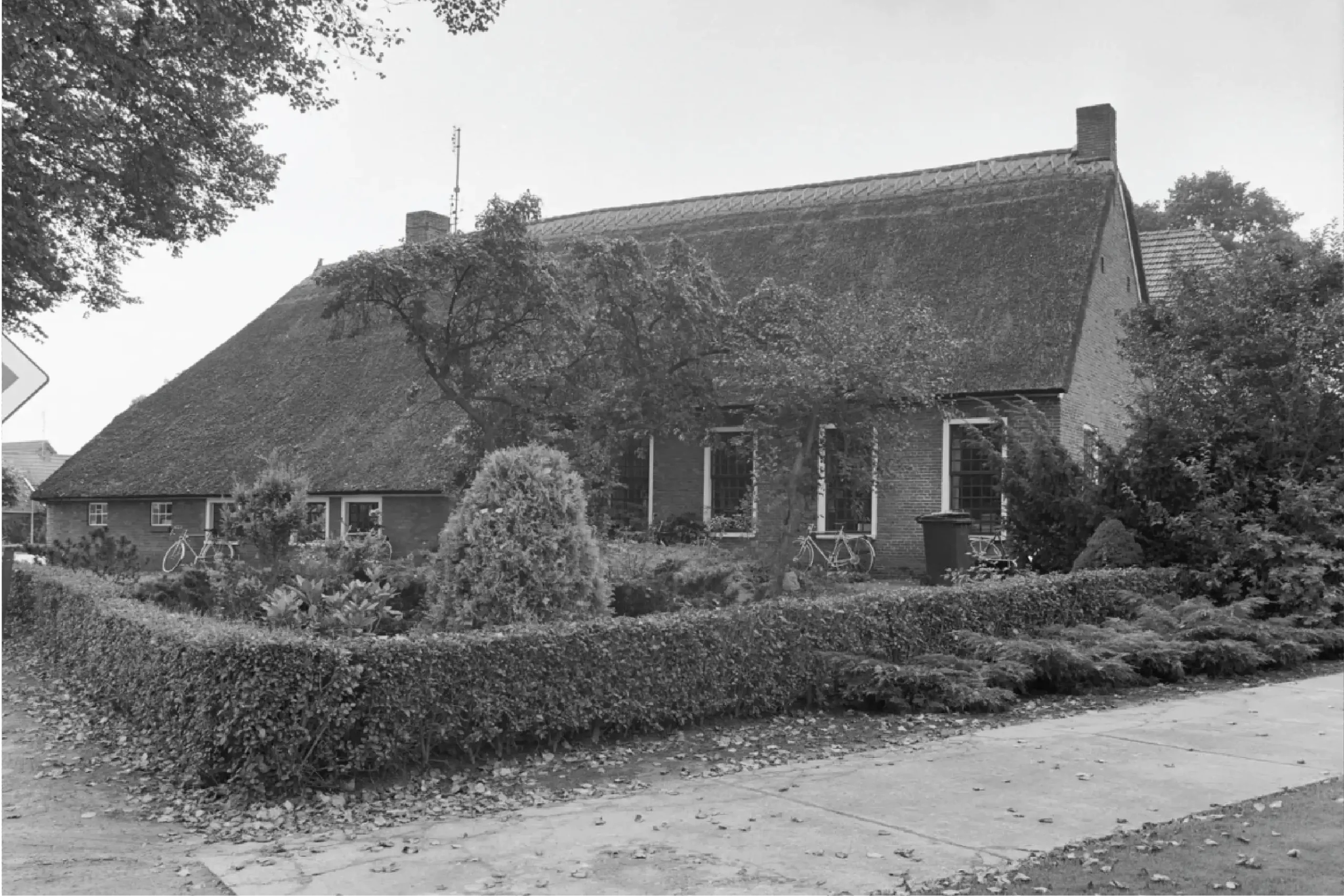De boerderije van L. Strating die hij verhuurde aan Jan Blom. Hier vanaf de Hunebedstraat aan de achterkant te bewonderen.