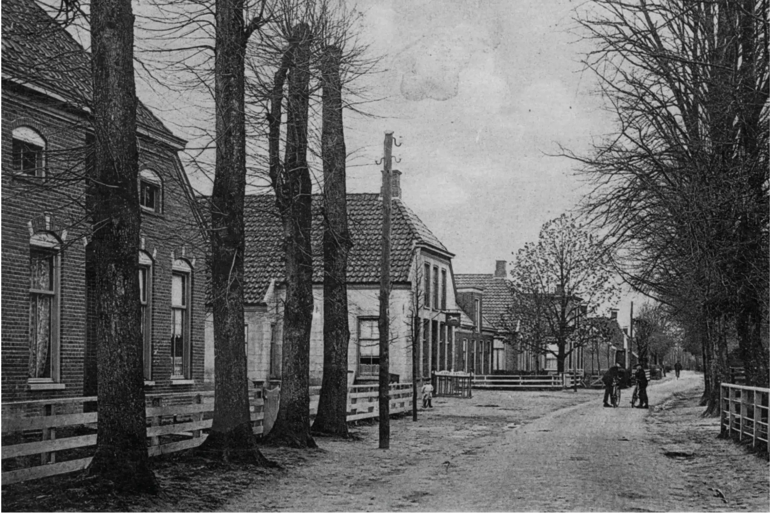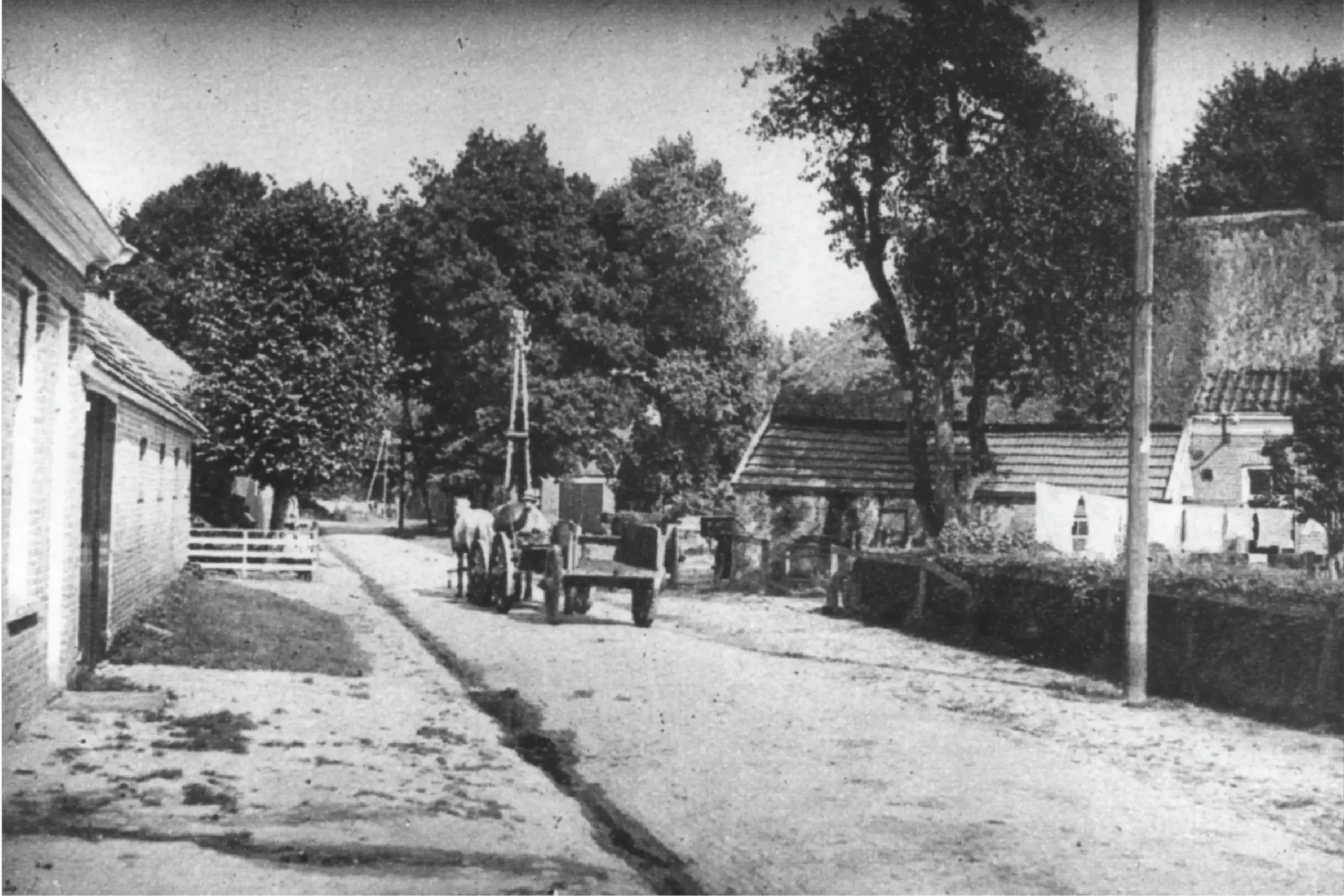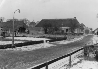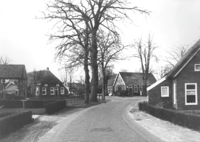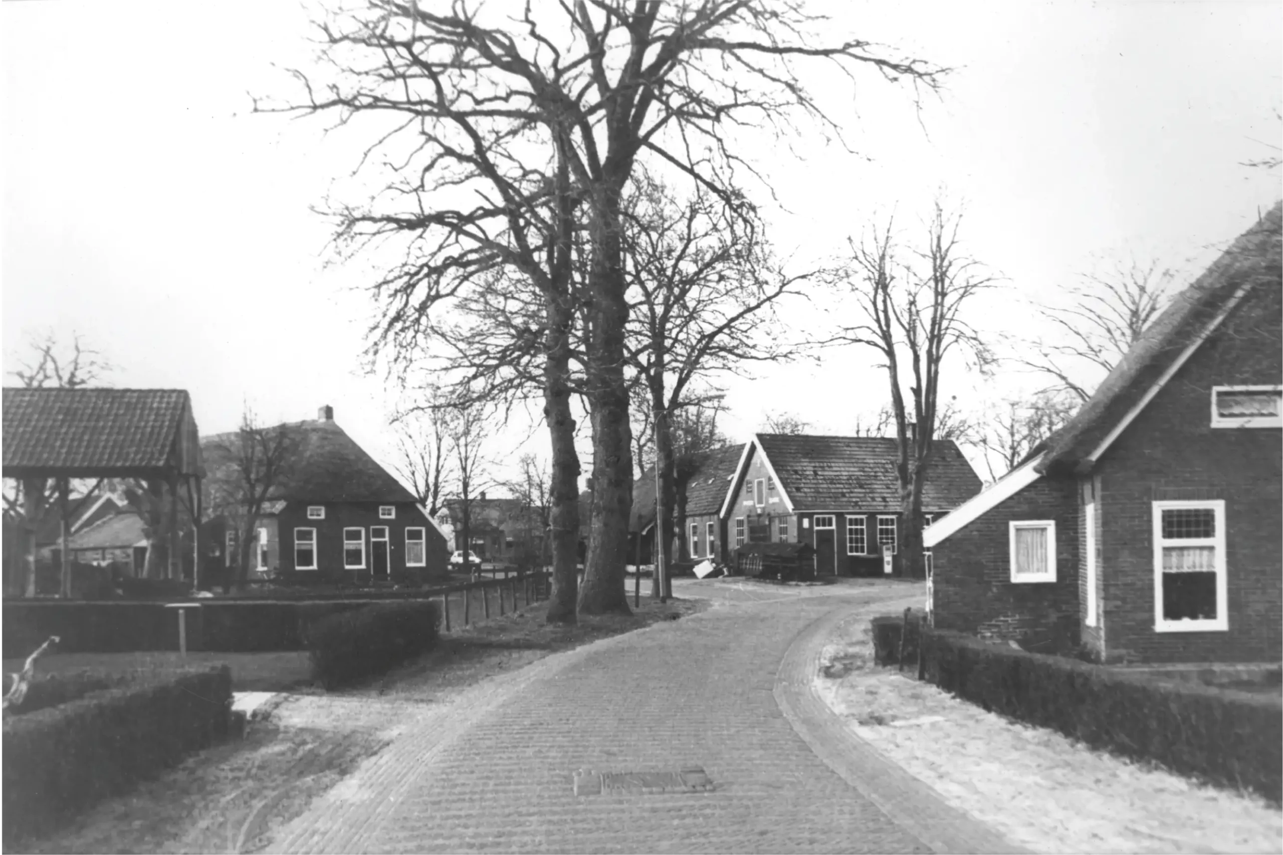 Gezicht vanuit de Koesteeg richting de Hoofdstraat. Uiters rechts eerst de boerderij van Hooveld, dan die van Wenning en dan nog de staldeur van wat later de museumboerderij is. Links de boerderij van Jacob (Job) Vedelaar.