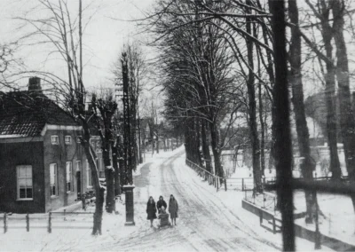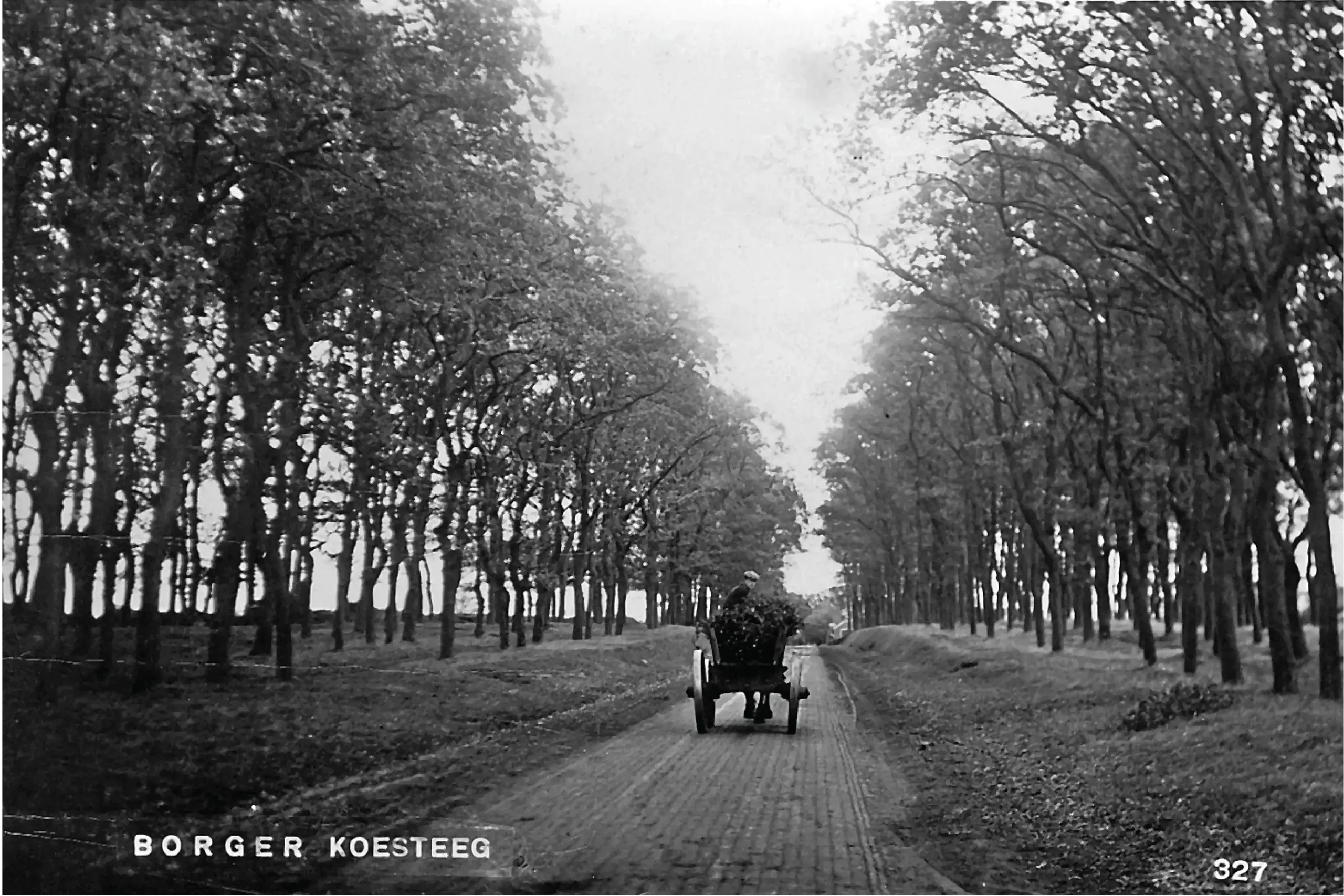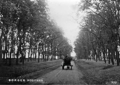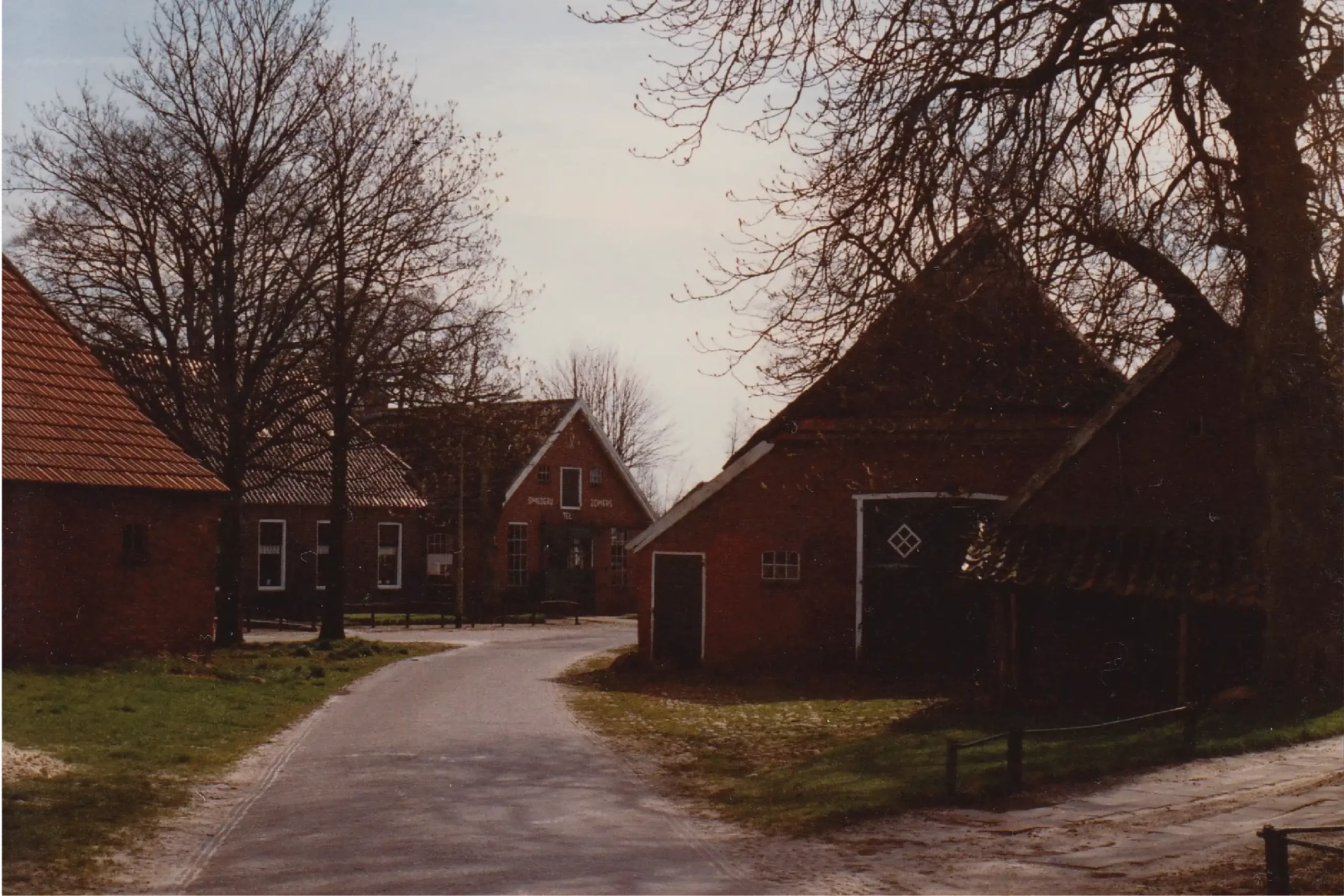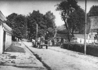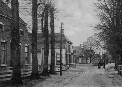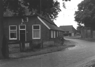Gezicht vanuit de Koesteeg richting de Hoofdstraat. Uiters rechts eerst de boerderij van Hooveld, dan die van Wenning en dan nog de staldeur van wat later de museumboerderij is. Links de boerderij van Jacob (Job) Vedelaar.