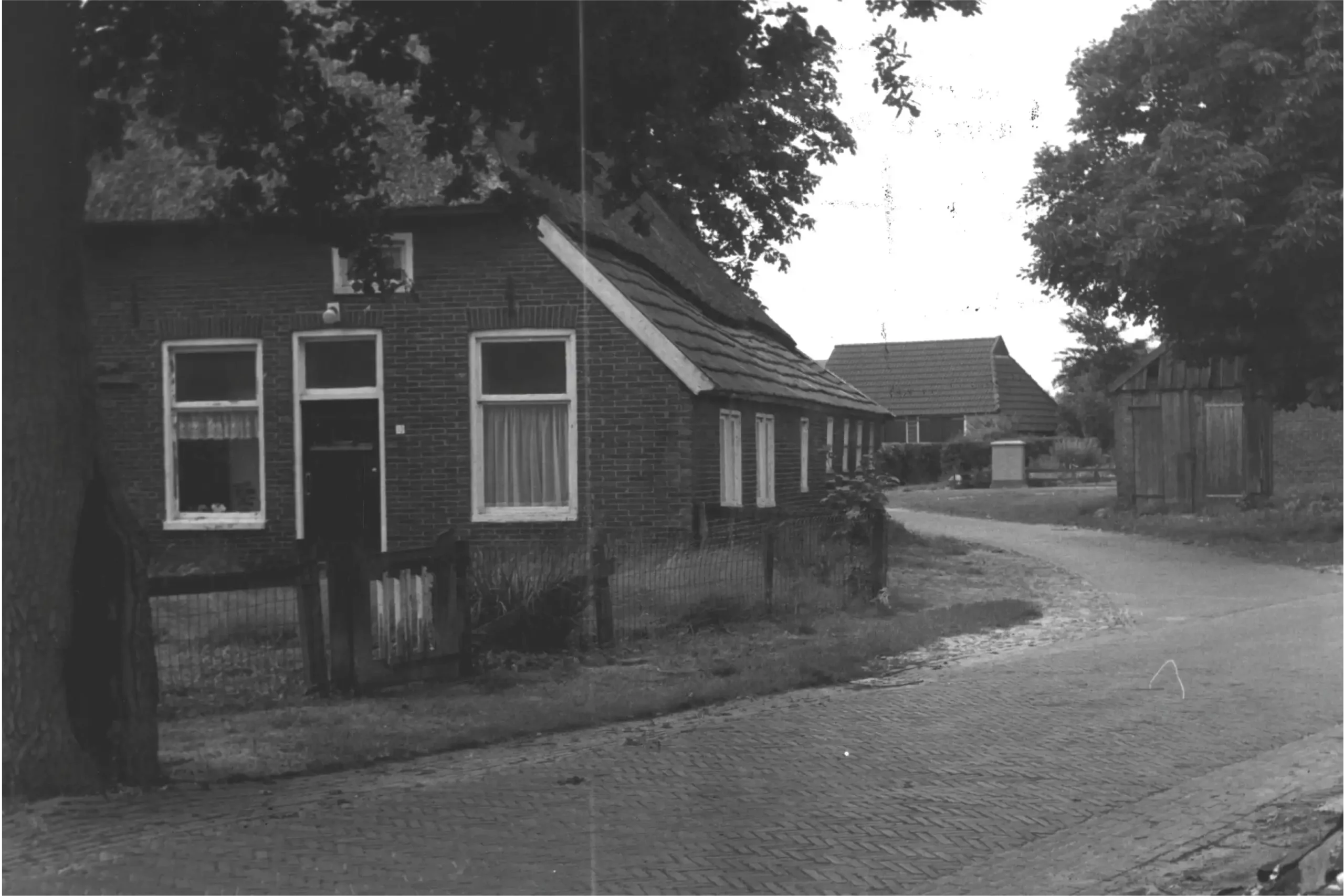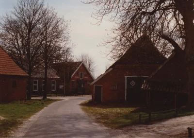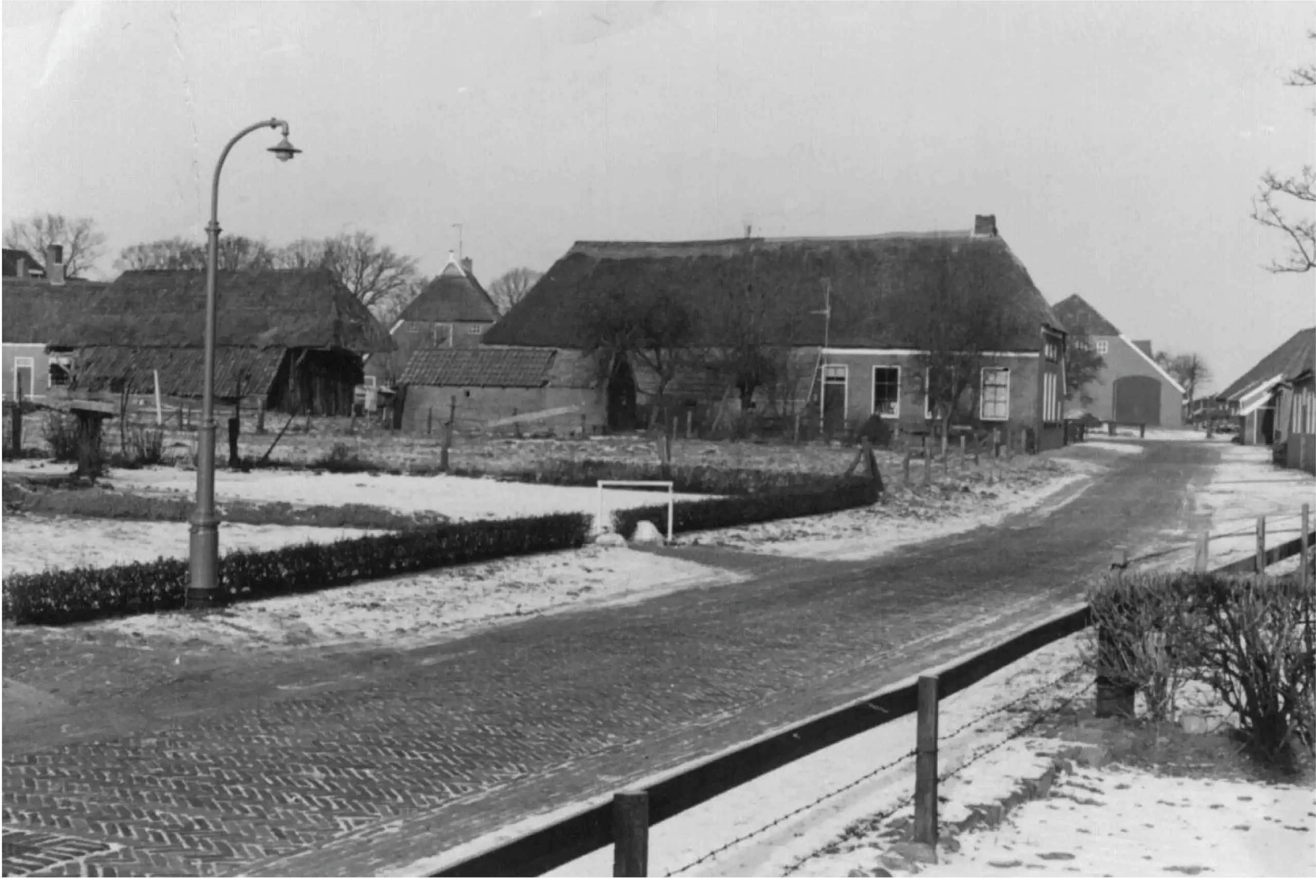 Geheel links staat de Kroezeschuur van Oudman/Kroeze, daarachter ziet u de boerderij van Albert en Jantje Rosing, daarvoor van Drewes Oudman en daarvoor van Jan Koeze. Rechts de boerderij van Jan Wenning. Naast de boerderij van Rosing staat smederij Zomers, voorheen van Kroeze.