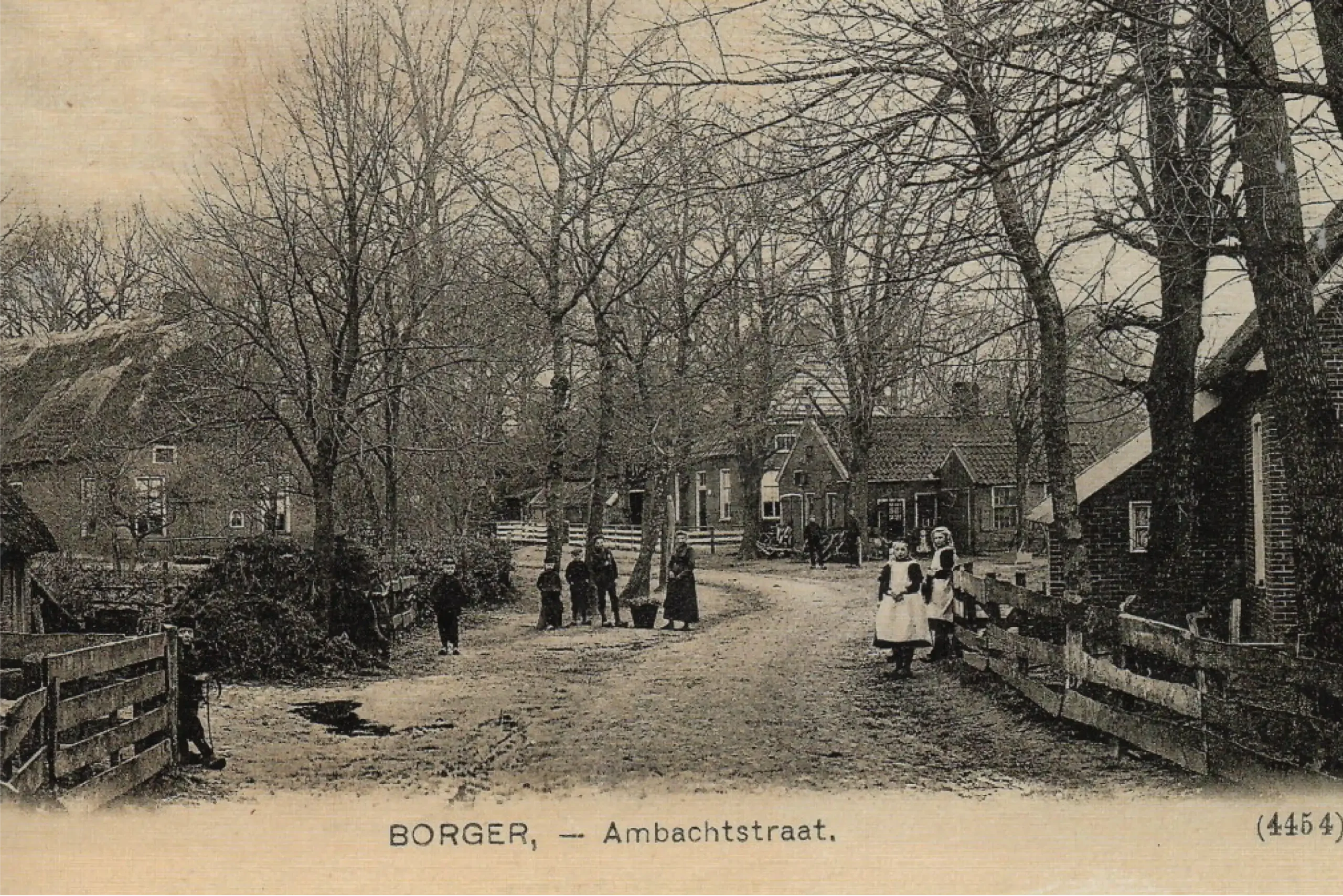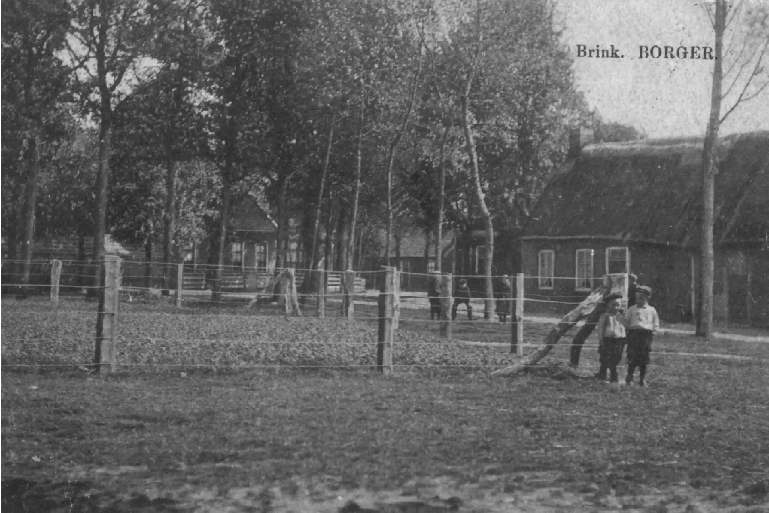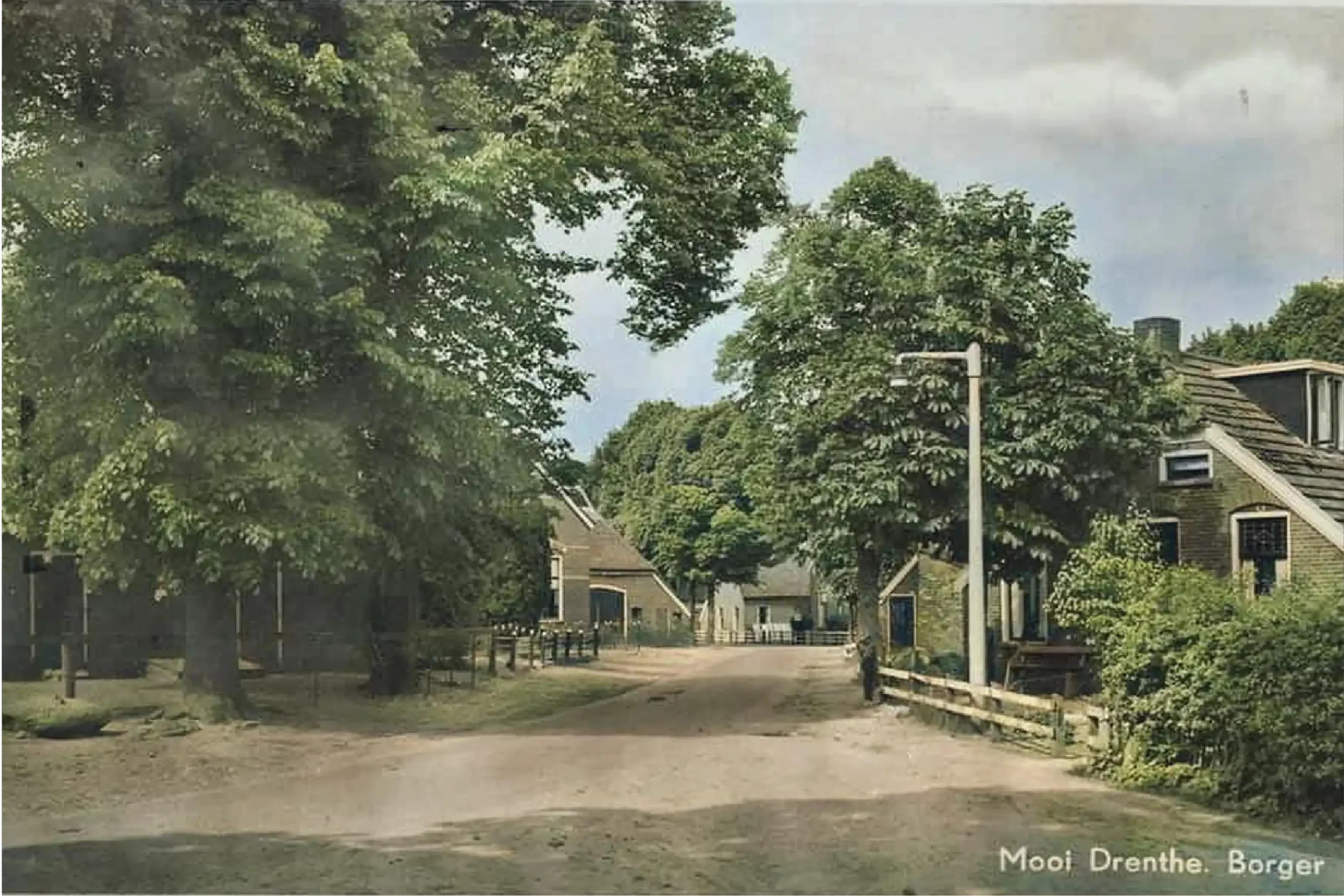 Een romantisch beeld uit oud-Borger van 1908. U ziet de boerderij van Wenning links (nummer 13) en verder vooruit de smederij van Kroeze met daarachter de boerderij van Kroeze (later Oudman en daarna Rosing).